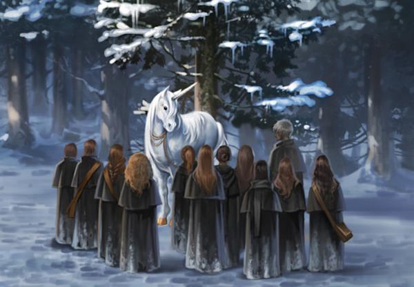 Beautiful, pure-white horned horses, unicorns are highly prized for their magical properties, including their horn, hair and blood. Born as golden foals, unicorns turn silver before growing their distinctive horn at age four and turning pure white as adults. Although there is significant value in unicorn hair and horn, especially in the creation of wands, the killing of a unicorn comes at a great price. Unicorn blood, distinctive for its silver-blue colour, will keep the drinker from death, but offers only a cursed half-life. This did not deter the likes of Lord Voldemort trying this method.