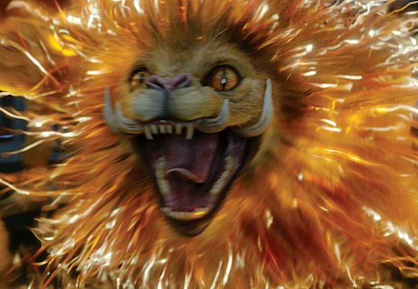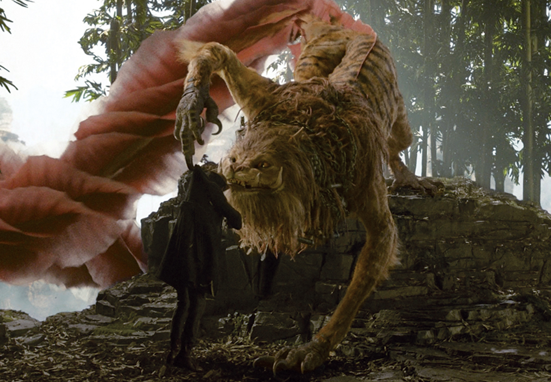 A five-coloured Chinese beast that resembled an elephant-sized cat, the Zouwu had a striped coat, straggly mane and four fangs that curled out of its mouth. It also had a distinctive long and multi-coloured tail. Capable of travelling 1000 miles a day, the creatures were incredibly powerful and terrifying to most wizards, although Newt Scamander dismissed the Zouwu's size and strength, claiming it was just like a big kitten.